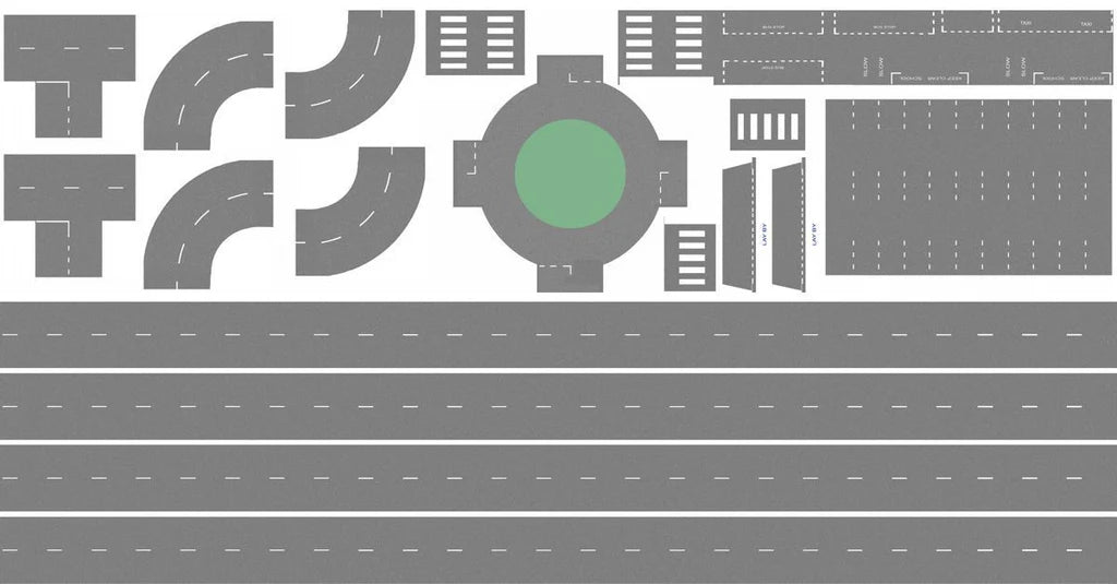 COSMETIC CONDITION: This pack contains: 4 x 1.5 meter lengths of road with centre marking, 1 x roundabout, 4 x 90 degree corners, 1 x car park, 3 x bus stops, 2 x laybyes, 1 x parking space, 2 x T-Junctions, 6 x pedestrian crossings, 4 x slow markings, 1 x taxi rank, 2 x keep clear school markings